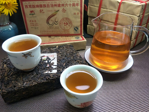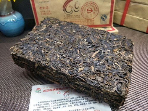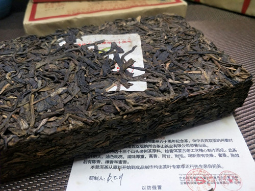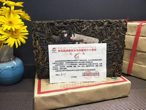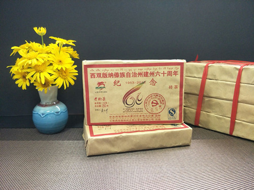 【特点】本片普洱茶是西双版纳傣族自治州建州六十周年纪念茶,由中共西双版纳州委对外宣传办公室监制、云南西双版纳州古茶山茶业有限公司荣誉出品。每片普洱茶从原料开始到成品制作均有茶叶专家李正行先生亲自把关。特选十三个山头老树茶原料,按普洱茶古老工艺精心制作而成。茶砖芽叶肥大,条索清晰油亮,开汤后汤色黄亮光泽,口感回甘生津,滋味厚重,茶气浓烈,汤香清扬。回甘快,口感层次多。高香且耐泡,叶底完整,有韧性。