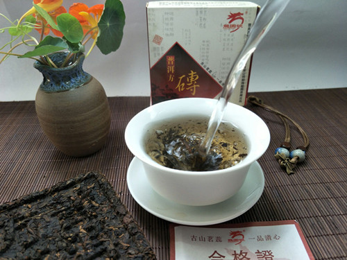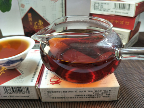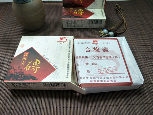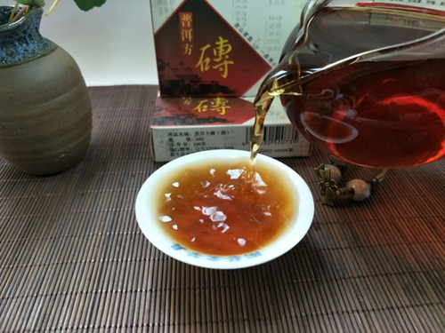 【产品特点】该茶选用西双版纳勐海高山优质大叶种乔木茶为原料,精心配比适度发酵,采用传统工艺高温蒸压而成。砖型周正,色泽褐栗油润,条索清晰粗壮,茶汤红浓明亮,香气浓郁,滋味鲜醇,口感厚实饱满,香甜润喉,韵味悠长,茶气充足,经久耐泡。是一款发酵很好的熟茶,品饮佳品,宜品宜藏。经过多年的干仓存放,属干仓老茶品,值得品鉴收藏。