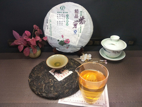 紫茶是云南大叶种茶的一个变异稀有品种。因其具有幼嫩芽叶呈紫红色,制成干茶成墨绿色,冲泡后呈青绿色的神奇变化,故被当地少数民族称之为“三色茶”。陆羽《茶经》中就有“茶者,紫者为上”之说。经检测,紫茶内含有效成分十分丰富,黄酮类化合物高于其他云南大叶种茶。用紫茶制成的普洱茶,汤色红浓透亮,香气独特,口感润滑,回甘持久。